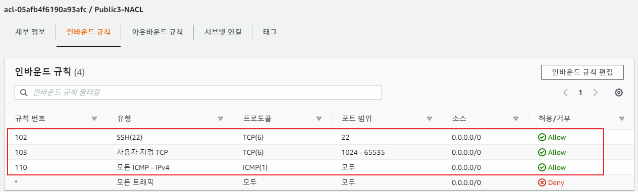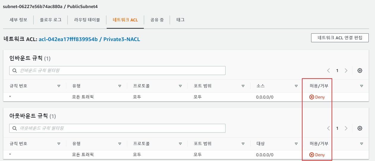 Instance3가 속해 있는 PublicSubnet4와 연결된 Private4-NACL 설정을 확인