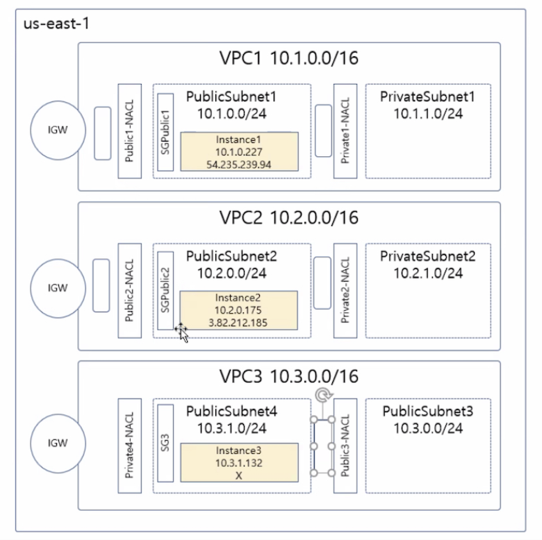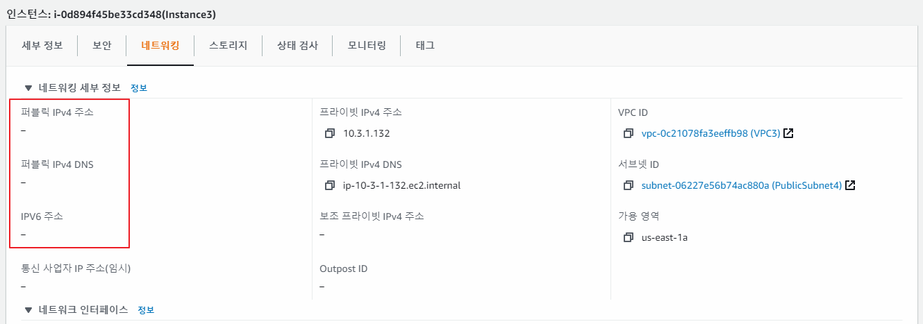 각 인스턴스에 SSH 접속 또는 ping 테스트를 시도 ⇒ Instance3은 퍼블릭 IP가 없어서 접근이 불가