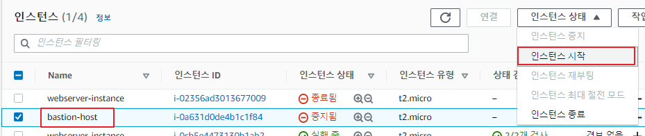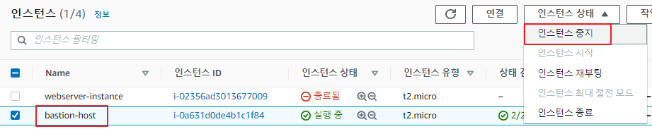 #6 기존에 동작하고 있던 인스턴스를 종료 → Auto Scaling 설정에 따라 (시작 구성에 설정된) 새로운 인스턴스가 생성