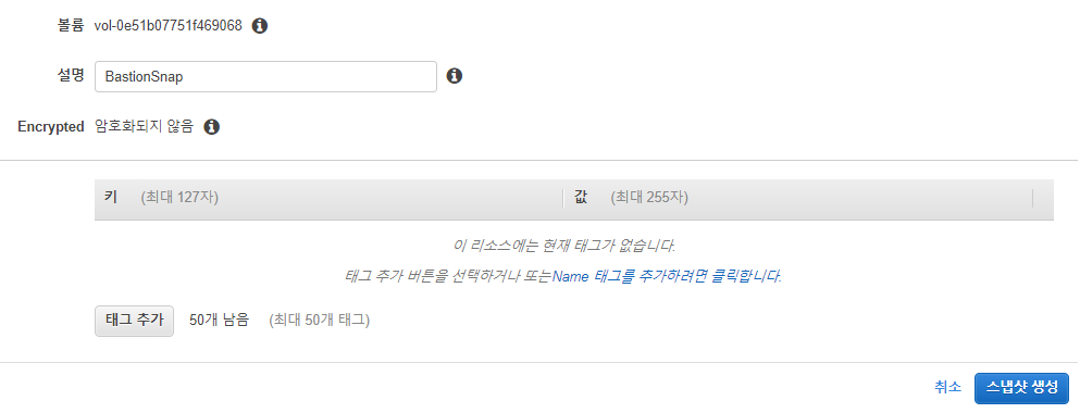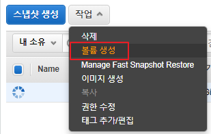 루트 디바이스의 볼륨 ID 링크를 클릭 후 작업에서 스냅샷 생성을 선택