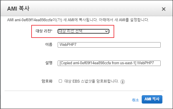 만약, 다른 리전에 인스턴를 생성할 경우에는 AMI 이미지를 복사해서 사용