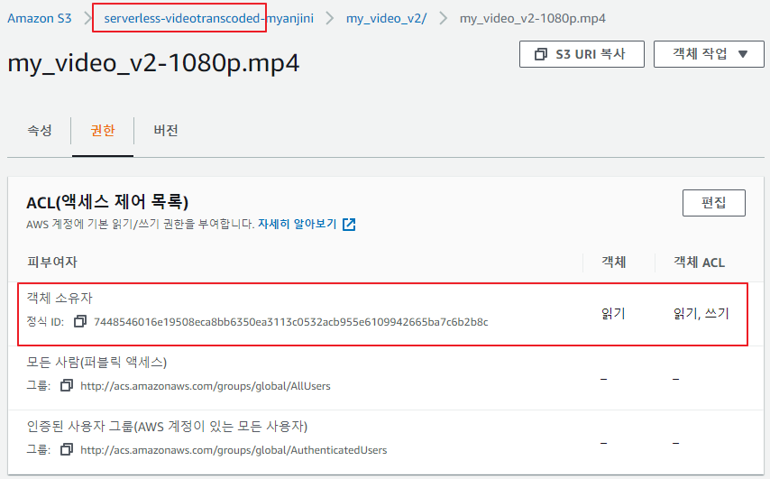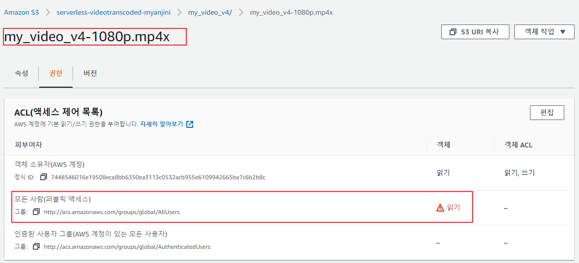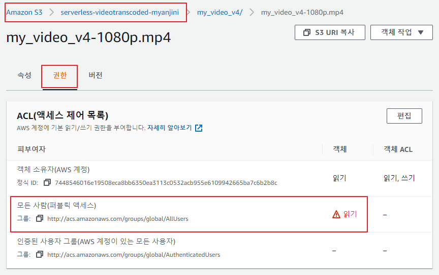 #5-1 트랜스 코딩된 파일이 저장되는 버킷의 파일 권한을 확인