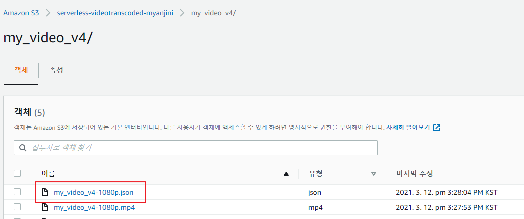 #5 트랜스 코딩 버킷에 이미지 3종과 메타데이터 3종이 생성된 것을 확인
