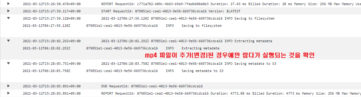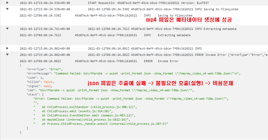 동영상 파일(트랜스 코딩된 동영상 파일, 3개가 생성)의 메타 정보를 추출해서 S3 버킷(트랜스 코딩된 파일이 저장되는 버킷)에 저장하는 람다 함수