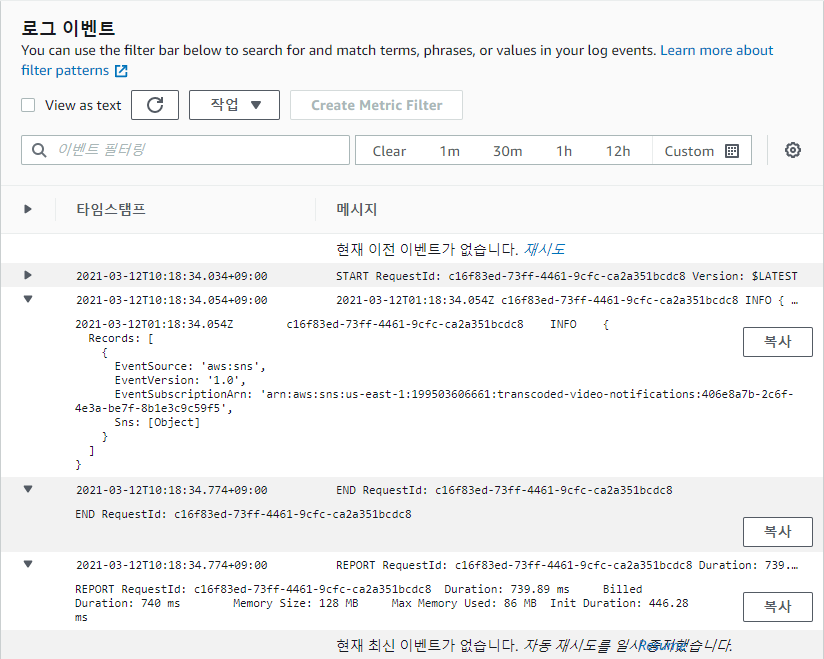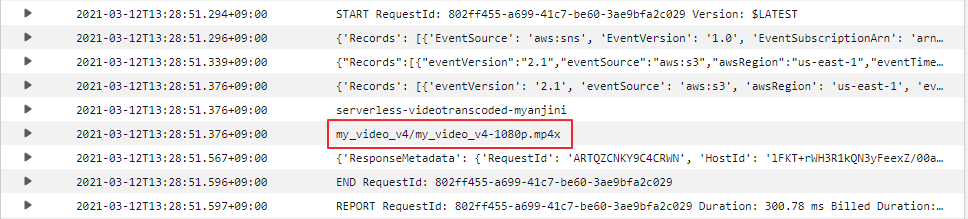 "Message":"{\"Records\":[{\"eventVersion\":\"2.1\",\"eventSource\":\"aws:s3\",\"awsRegion\":\"us-east-1\",\"eventTime\":\"2021-03-12T02:13:24.863Z\",\"eventName\":\"ObjectCreated:Copy\",\"userIdentity\":{\"principalId\":\"A357J5TEV9LLY5\"},\"requestParameters\":{\"sourceIPAddress\":\"211.33.180.73\"},\"responseElements\":{\"x-amz-request-id\":\"5RM6ZHKZZ14DMZP5\",\"x-amz-id-2\":\"me++pK16BL4UKGnkm67PcTgbdSP9TdoWJRG8uQ8HrEeBGFfHg5yTjD+R5LAGbZH1fp2ERN2V5NZLc/PGYFKUvM4sylRxpbzz\"},\"s3\":{\"s3SchemaVersion\":\"1.0\",\"configurationId\":\"Transcoded Video\",\"bucket\":{\"name\":\"serverless-videotranscoded-myanjini\",\"ownerIdentity\":{\"principalId\":\"A357J5TEV9LLY5\"},\"arn\":\"arn:aws:s3:::serverless-videotranscoded-myanjini\"},\"object\":{\"key\":\"my_video_v4/my_video_v4-1080p.mp4\",\"size\":14044196,\"eTag\":\"3c111f7192177b6f371fab15825edf4a\",\"sequencer\":\"00604ACE4C53A62126\"}}}]}",