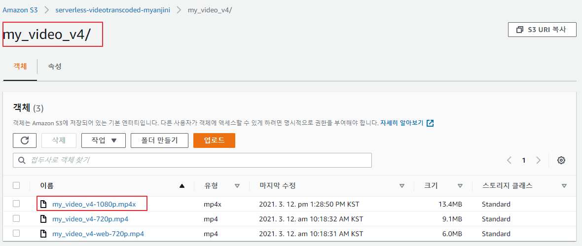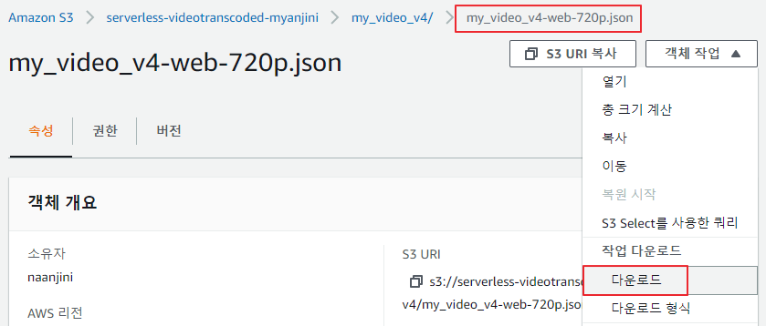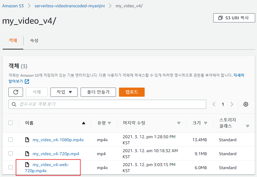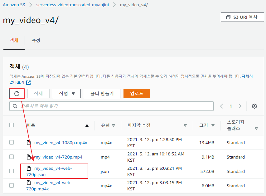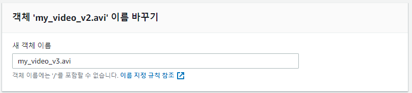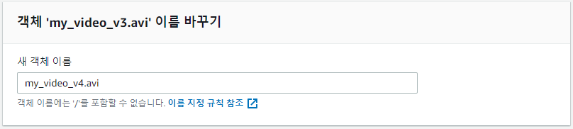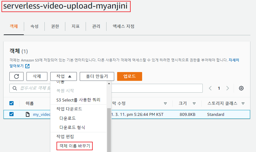 트랜스 코딩된 결과를 저장하는 버킷의 파일 중 하나의 이름을 변경
