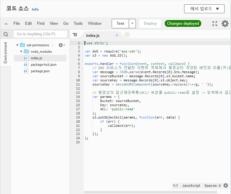 // P66 'use stric'; var AWS = require('aws-sdk'); var s3 = new AWS.S3(); exports.handler = function(event, context, callback) { // SNS 서비스가 전달한 이벤트 객체에서 동영상이 저장된 버킷과 이름(키)을 추출 var message = JSON.parse(event.Records[0].Sns.Message); // 참조1의 붉은색 부분을 가져와서 JSON 형식으로 변환 var sourceBucket = message.Records[0].s3.bucket.name; var sourceKey = message.Records[0].s3.object.key; sourceKey = decodeURIComponent(sourceKey.replace(/\+/g, ' ')); // 동영상의 접근제어목록(ACL) 속성을 public-read로 설정 -> 외부에서 접근 가능 var params = { Bucket: sourceBucket, Key: sourceKey, ACL: 'public-read' }; s3.putObjectAcl(params, function(err, data) { if (err) { callback(err); } }); }; |