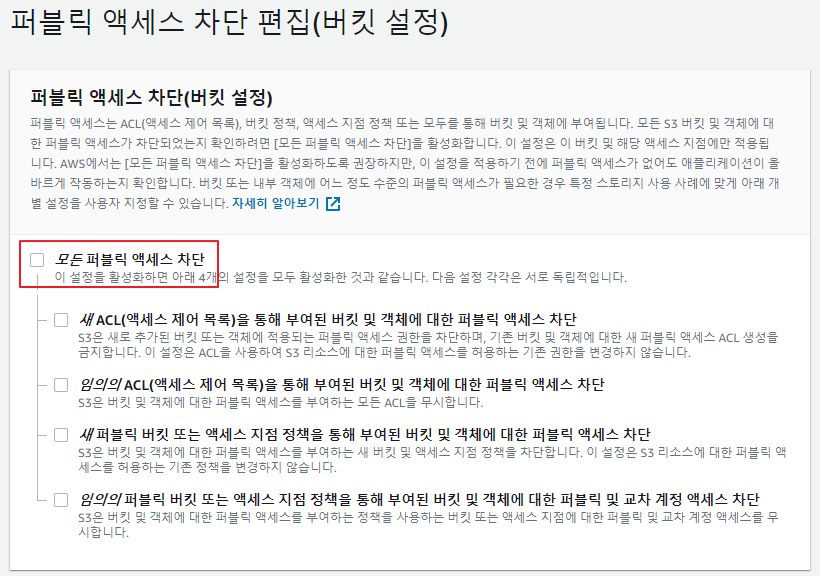 #5-7 해당 버킷을 접근할 수 있도록 퍼블릭 액세스 차단을 해제