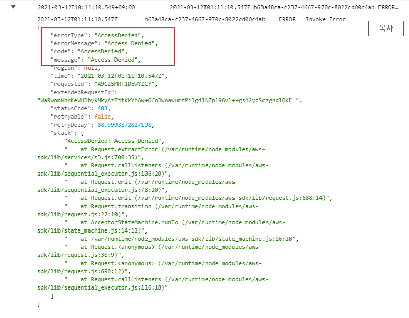 ⇒ 파일이 저장된 버킷에 접근 권한이 없어서 파일의 ACL을 변경할 수 없음