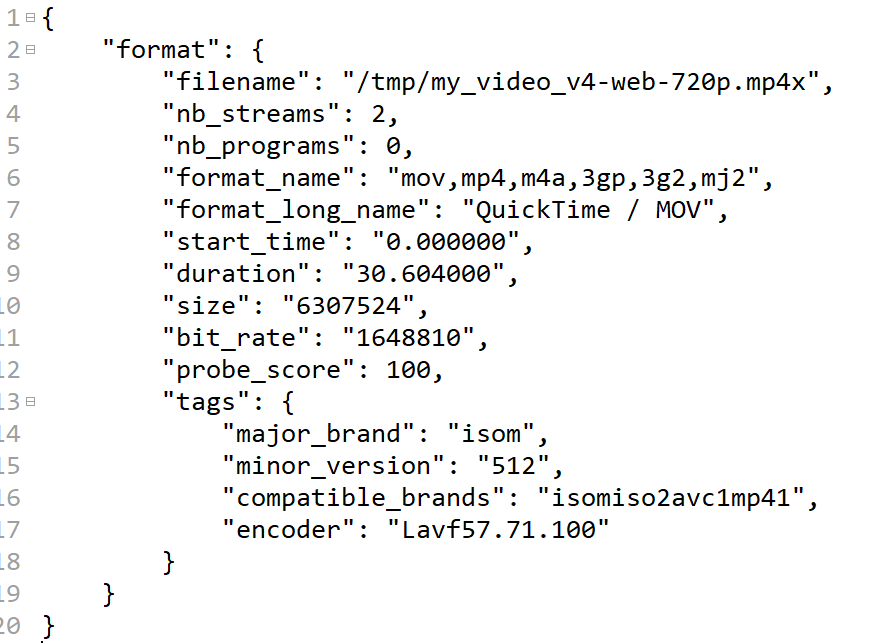 [ec2-user@ip-172-31-62-117 ffmpeg-4.2.2-amd64-static]$ pwd /home/ec2-user/ffmpeg-4.2.2-amd64-static [ec2-user@ip-172-31-62-117 ffmpeg-4.2.2-amd64-static]$ cd /home/ec2-user/ffmpeg-4.2.2-amd64-static [ec2-user@ip-172-31-62-117 ffmpeg-4.2.2-amd64-static]$ wget https://file-examples-com.github.io/uploads/2018/04/file_example_AVI_480_750kB.avi --2021-03-12 05:41:28-- https://file-examples-com.github.io/uploads/2018/04/file_example_AVI_480_750kB.avi Resolving file-examples-com.github.io (file-examples-com.github.io)... 185.199.109.153, 185.199.110.153, 185.199.111.153, ... Connecting to file-examples-com.github.io (file-examples-com.github.io)|185.199.109.153|:443... connected. HTTP request sent, awaiting response... 200 OK Length: 742478 (725K) [video/x-msvideo] Saving to: ‘file_example_AVI_480_750kB.avi’ 100%[=================================================================================>] 742,478 --.-K/s in 0.01s 2021-03-12 05:41:28 (47.6 MB/s) - ‘file_example_AVI_480_750kB.avi’ saved [742478/742478] [ec2-user@ip-172-31-62-117 ffmpeg-4.2.2-amd64-static]$ ll total 146040 -rwxr-xr-x 1 ec2-user ec2-user 74074472 Mar 2 2020 ffmpeg -rwxr-xr-x 1 ec2-user ec2-user 73988648 Mar 2 2020 ffprobe -rw-rw-r-- 1 ec2-user ec2-user 742478 Jul 9 2020 file_example_AVI_480_750kB.avi -rw-r--r-- 1 ec2-user ec2-user 35147 Mar 2 2020 GPLv3.txt drwxr-xr-x 2 ec2-user ec2-user 309 Mar 2 2020 manpages drwxr-xr-x 7 ec2-user ec2-user 255 Mar 2 2020 model -rwxr-xr-x 1 ec2-user ec2-user 690888 Mar 2 2020 qt-faststart -rw-r--r-- 1 ec2-user ec2-user 2140 Mar 2 2020 readme.txt [ec2-user@ip-172-31-62-117 ffmpeg-4.2.2-amd64-static]$ ./ffprobe -v quiet -print_format json -show_format ./file_example_AVI_480_750kB.avi { "format": { "filename": "./file_example_AVI_480_750kB.avi", "nb_streams": 2, "nb_programs": 0, "format_name": "avi", "format_long_name": "AVI (Audio Video Interleaved)", "start_time": "0.000000", "duration": "30.613333", "size": "742478", "bit_rate": "194027", "probe_score": 100, "tags": { "encoder": "Lavf57.19.100" } } } |
