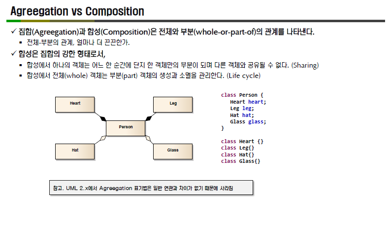 -집합관계 : 떼어낼 수 있는 것. 다른 클래스에서도 사용되어질 수 있는 것.