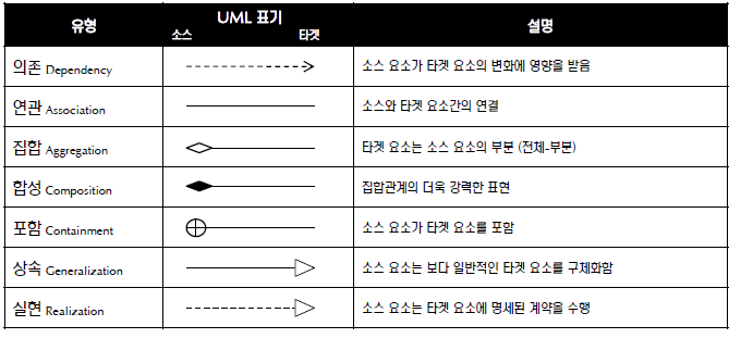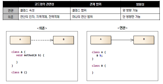 의존(점선) : 특정 메소드 안에서 사용함& 연관관계(실선) 파악