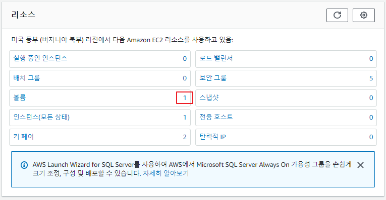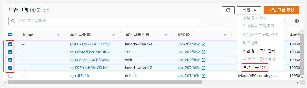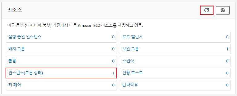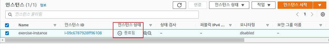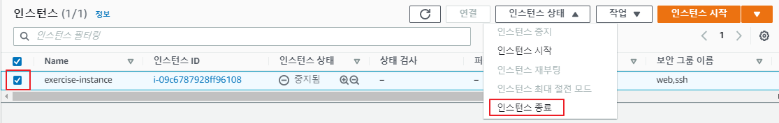종료된 인스턴스 1개와 기본 보안 그룹 1개만 보여야 함