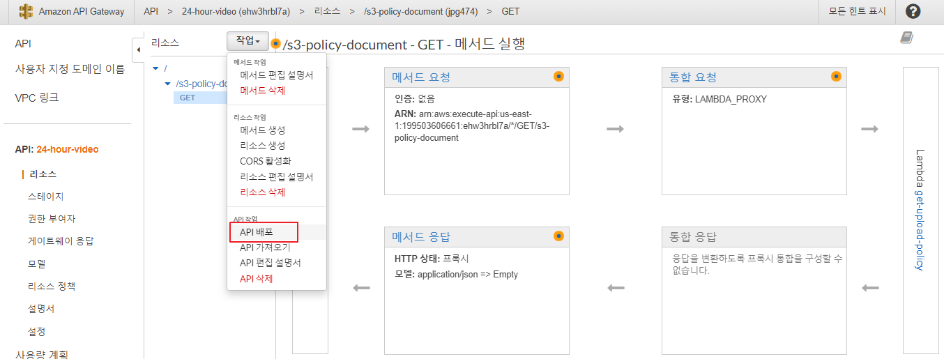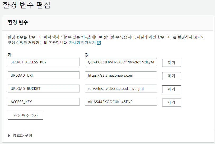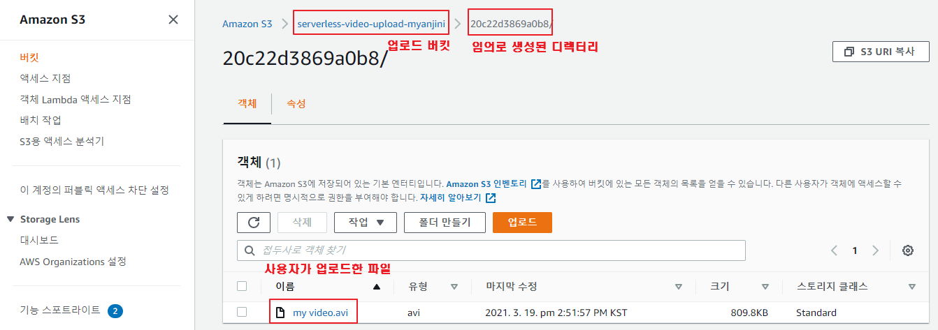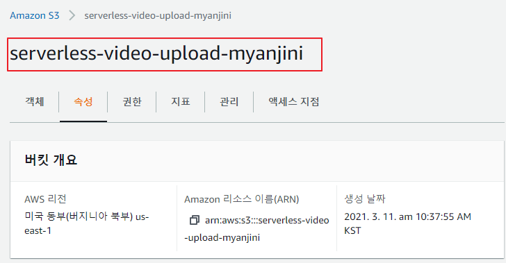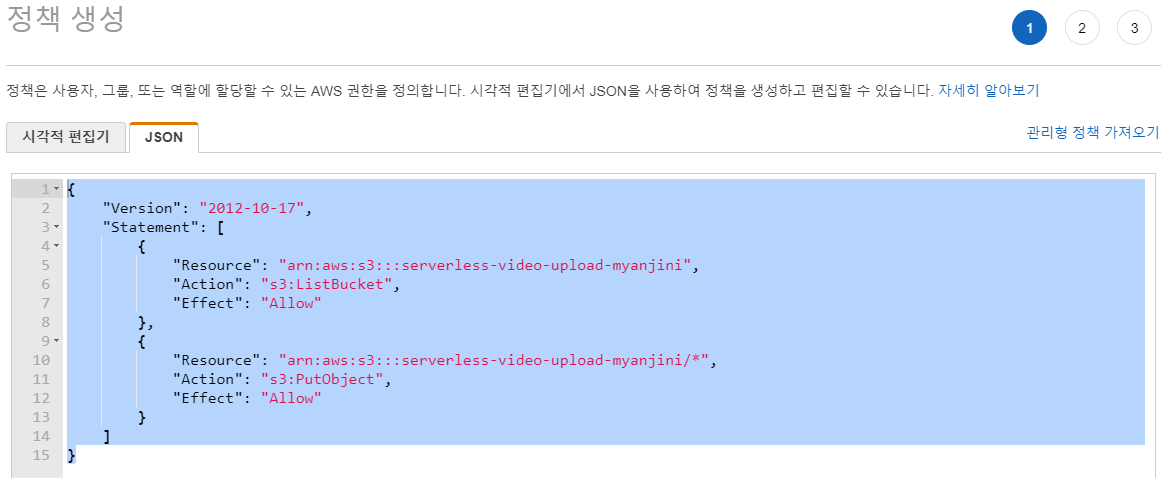 "Resource": "arn:aws:s3:::serverless-video-upload-myanjini", ⇐ 업로드 버밋의 ARN