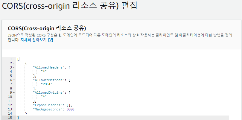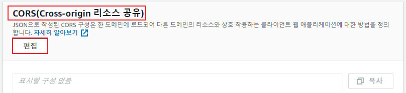 ⇒ S3 버킷에 CORS 설정이 필요