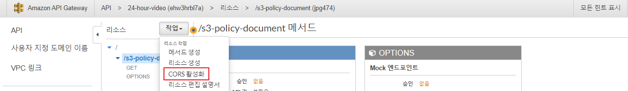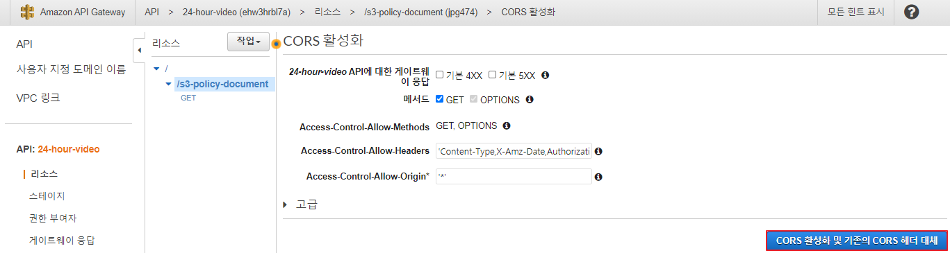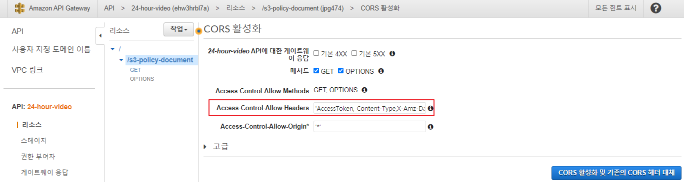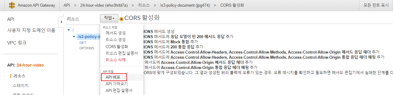 ⇒ 24-hour-video API의 CORS 활성화 후 재배포