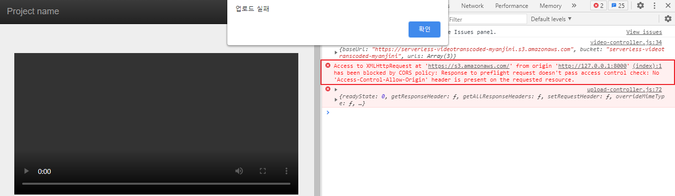 "업로드 실패" ⇒ 파일을 S3 버킷에 업로드했을 때 나오는 메시지 ⇒ s3-upload-policy 람다 함수 호출(실행)은 완료되었음을 의미