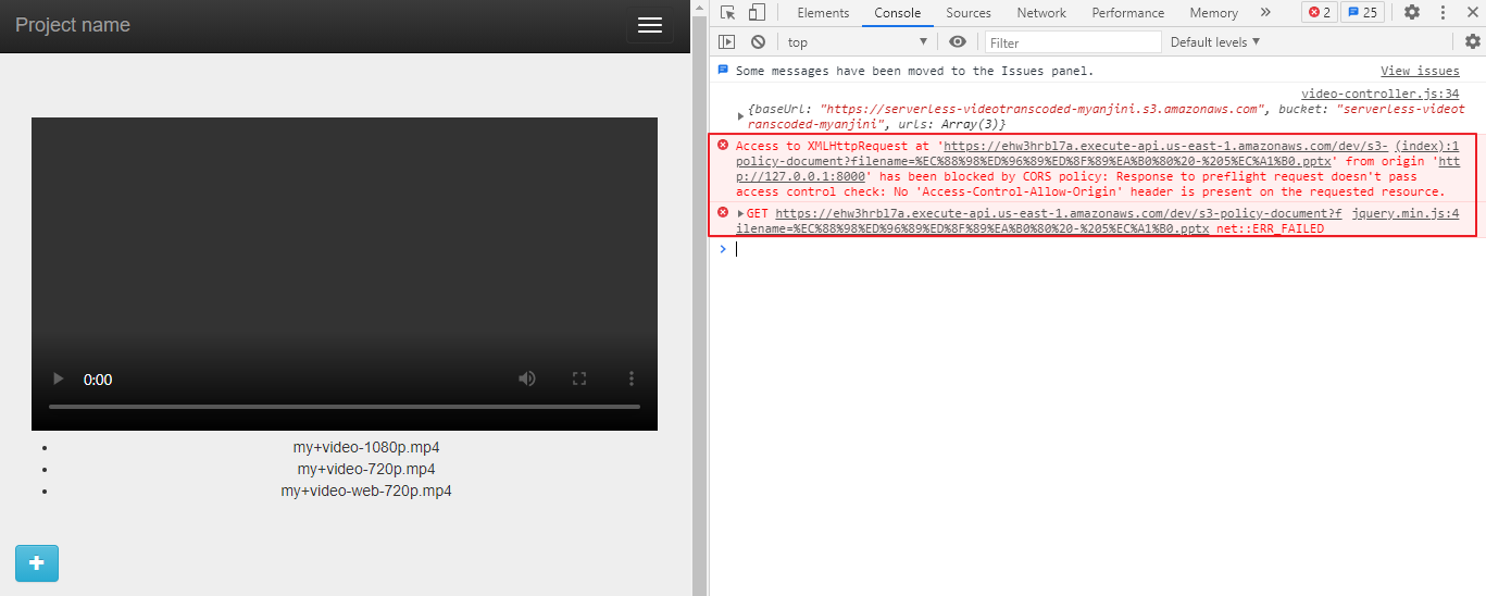 Access to XMLHttpRequest at 'https://ehw3hrbl7a.execute-api.us-east-1.amazonaws.com/dev/s3-policy-document?filename=%EC%88%98%ED%96%89%ED%8F%89%EA%B0%80%20-%205%EC%A1%B0.pptx' from origin 'http://127.0.0.1:8000' has been blocked by CORS policy: Response to preflight request doesn't pass access control check: No 'Access-Control-Allow-Origin' header is present on the requested resource.