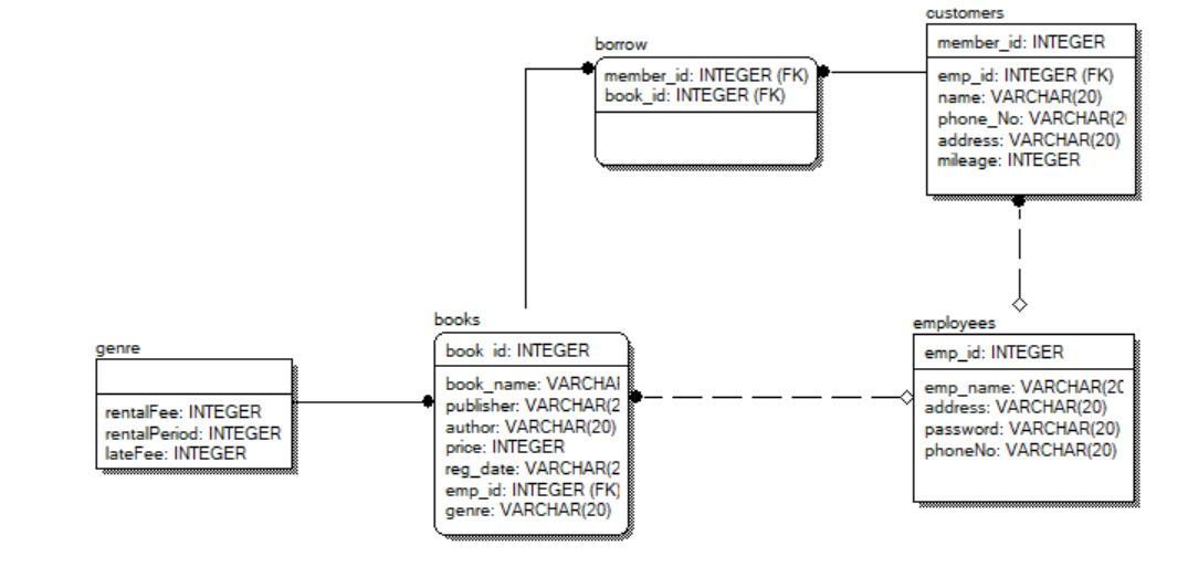 -점선은 비식별자 관계(book과 직원), 실선은 식별자 관계(상속관계)