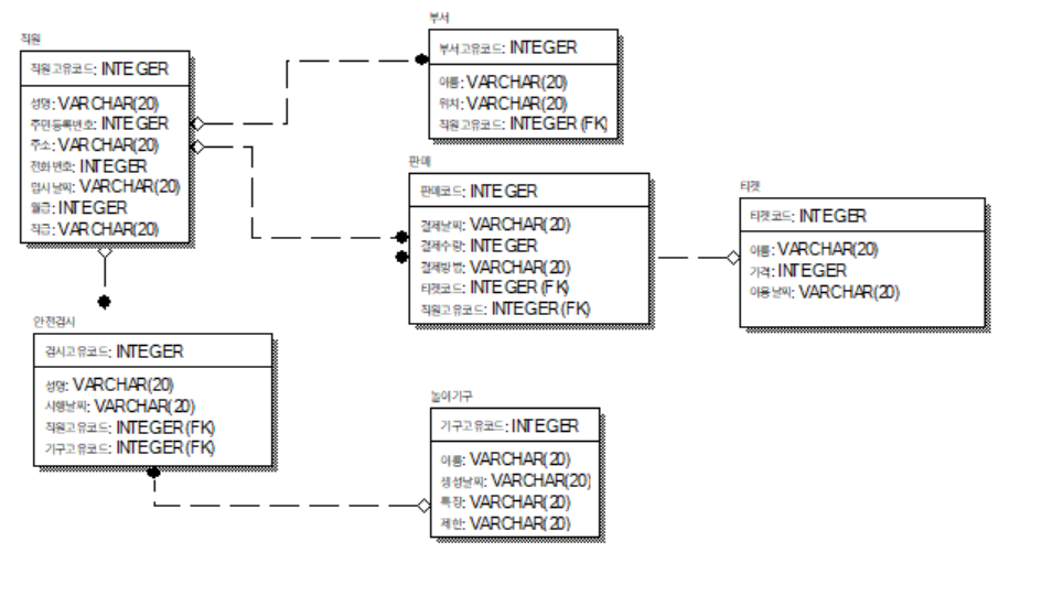 부서는 고유코드, 이름, 위치에 관한 정보를 가진다. 그리고 부서 종류에는 티켓 관리부서, 놀이기구 관리부서,