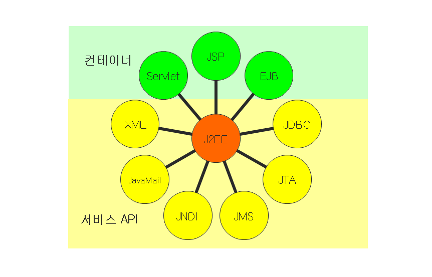 J2EE : 클라이언트/서버 환경에나 웹 환경의 서버 단에서 수행되는 프로그램을 자바로 구현하고자 할 때 사용하는 자바기술