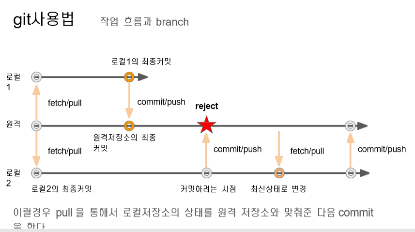 로컬 2에서 pull을 받고 내 정보를 최신버전으로 업글하고 commit해야 reject안당함 => pull할때 데이터 잘날라가서