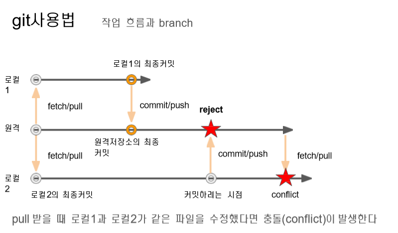 똑같은 html을 서로가 고쳐서 push로 보내는데 이미 다른사람이 push해서 새로운 버전이 나있는상태. 다른사람이 push하면 충돌이 뜨기 때문에 merge하고 push하라고 에러메시지가 뜸 그러면 merge하고 내가 원하는 순서 정해서 저장하고 push하기