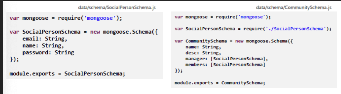 Community는 관리자 및 회원의 Sub Document가 존재합니다. 이 경우 앞서 정의한 SocialPersonSchema를 이용합니다.