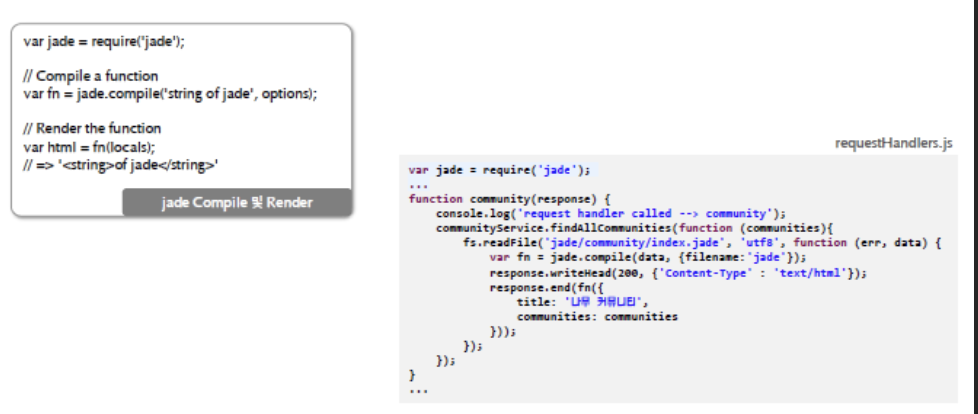 jade 포맷의 파일을 fs 모듈로 읽고 컴파일 및 렌더링 과정을 거칩니다.
