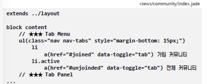 기존의 jade 파일 내용 중 컨텐츠 부분을 block content 로 정의하고 하위 코드로 둡니다.