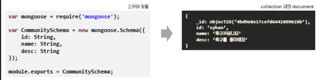 Node 서버 내의 데이터 객체와 MongoDB에 저장되는 Documnet 구조를 매핑하는 역할을 합니다.