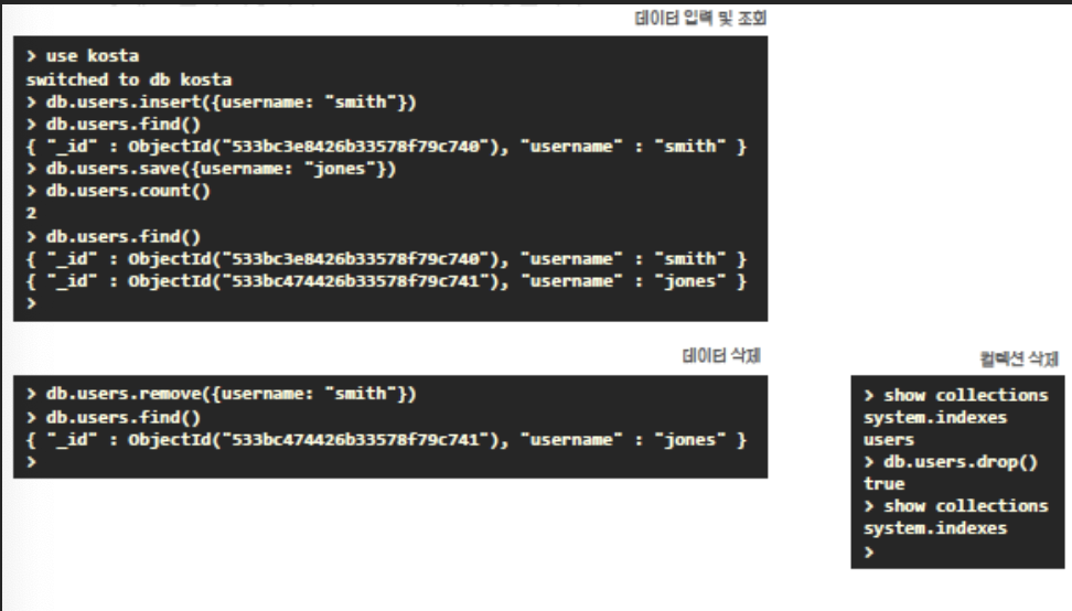 db.users.save({username: "jones"}) //insert, save로 데이터를 넣을 수 있음
