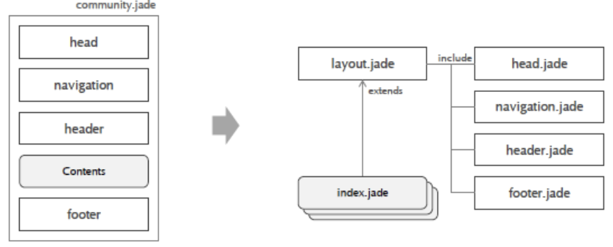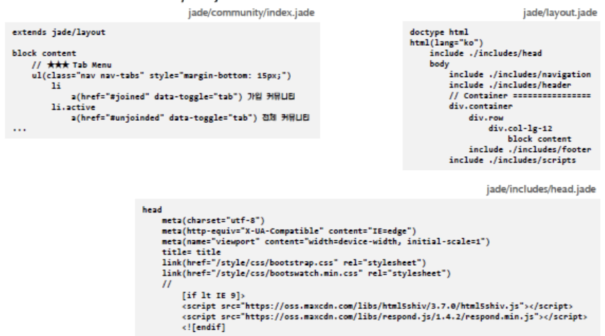 컨텐츠를 제외한 나머지 코드들은 layout.jade로 옮긴 후 필요시 적절히 include 파일로 분할하여 관리합니다.