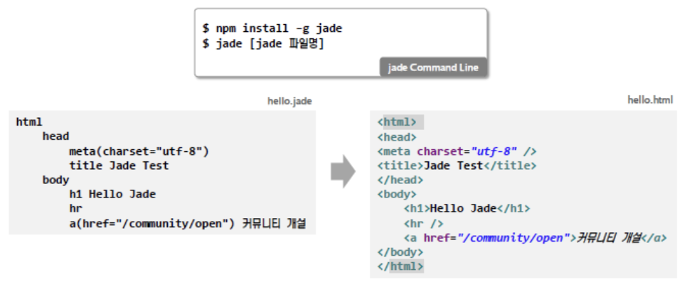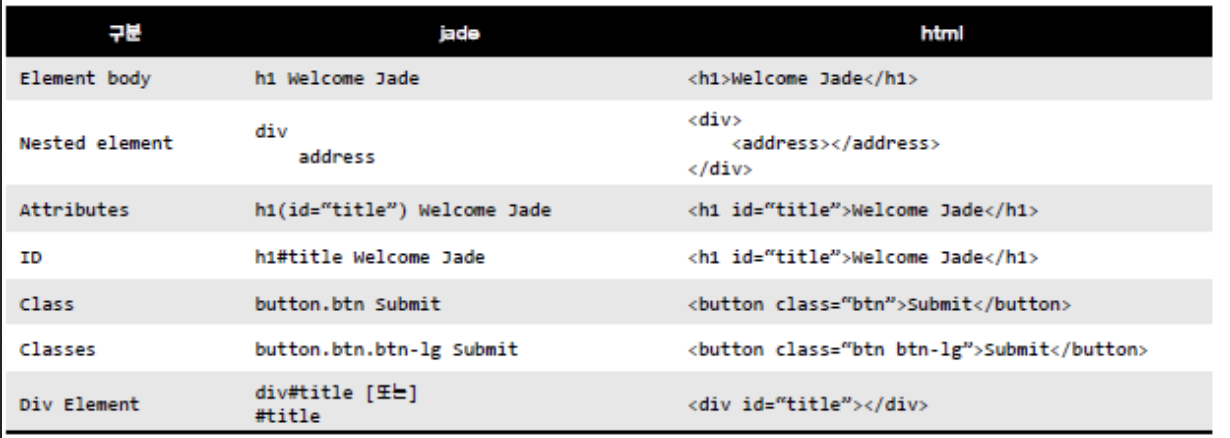 Node.js의 Template Engine으로는 jade를 가장 많이 사용합니다.