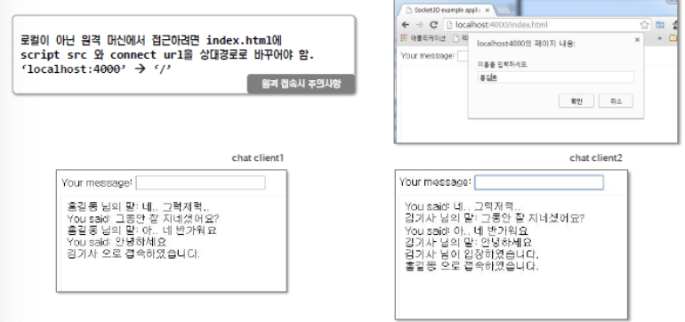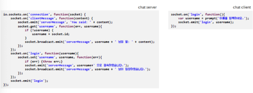 클라이언트는 'login' 이벤트를 받아서 사용자 이름을 입력받은 후 'login' 이벤트로 다시 이름을 전송합니다.