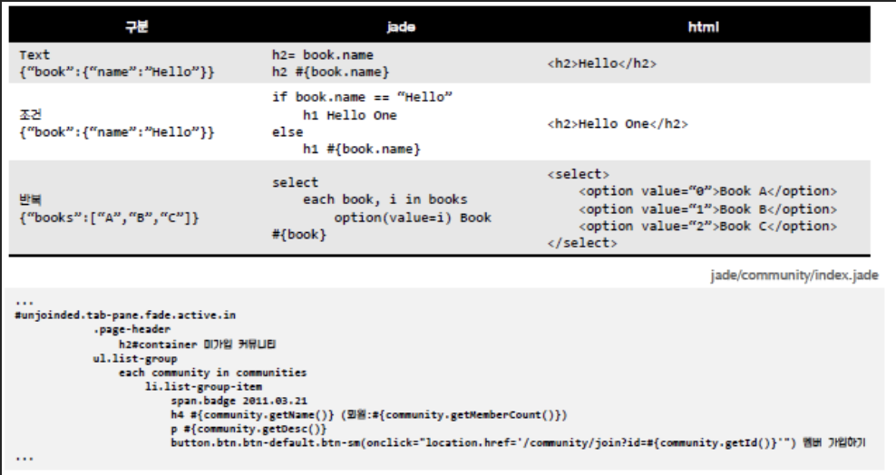 Jade의 반복문 및 조건문 텍스트 출력 등을 이용할 수 있습니다.