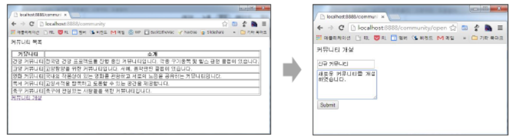 /community 요청을 보내면 커뮤니티 목록 화면이 출력되며 '커뮤니티 개설'을 선택하면 입력 화면으로 이동합니다.