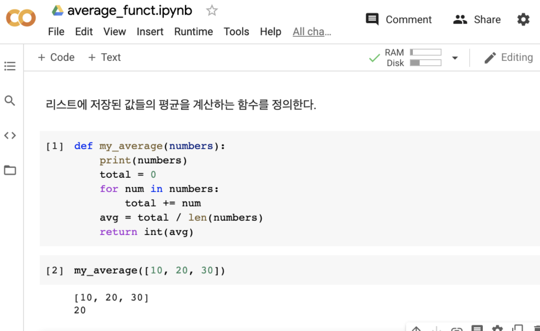 # list에 저장된 값의 평균을 계산하는 함수 정의