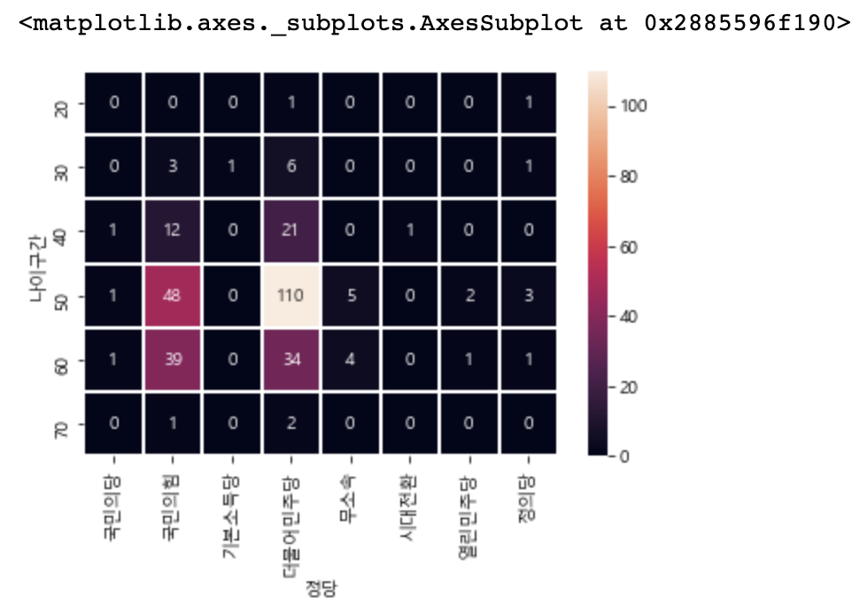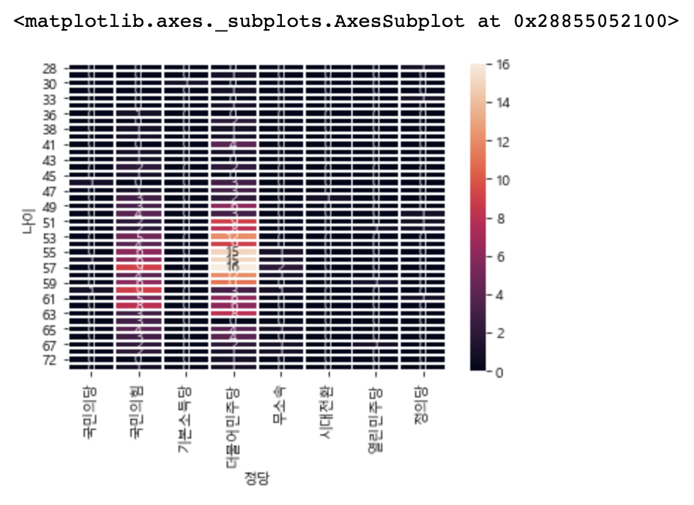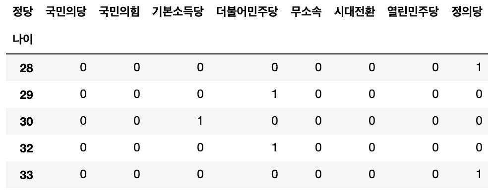 age_pivot_df=member_df.pivot_table(index='나이',columns='정당',aggfunc='size').fillna(0).astype(int)