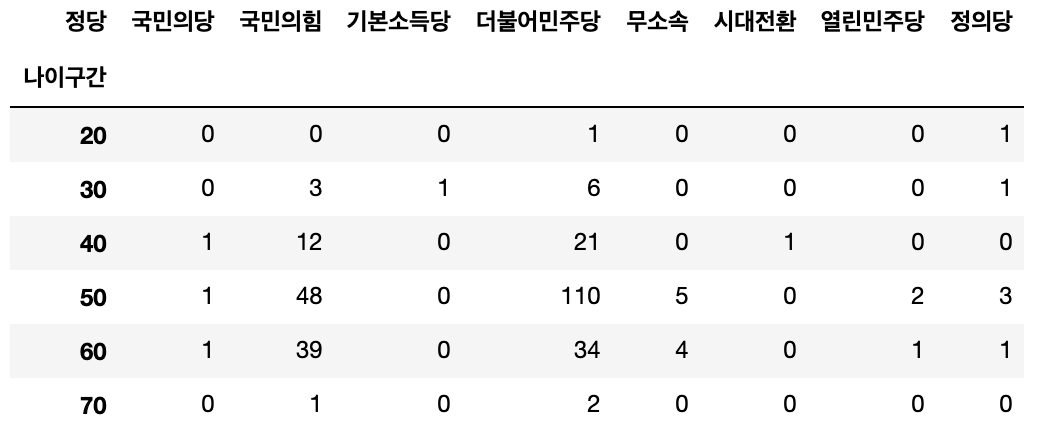 age_pivot_df=member_df.pivot_table(index='나이구간',columns='정당',aggfunc='size')\