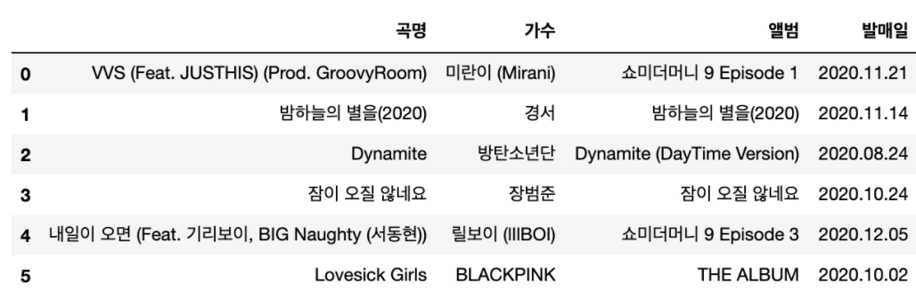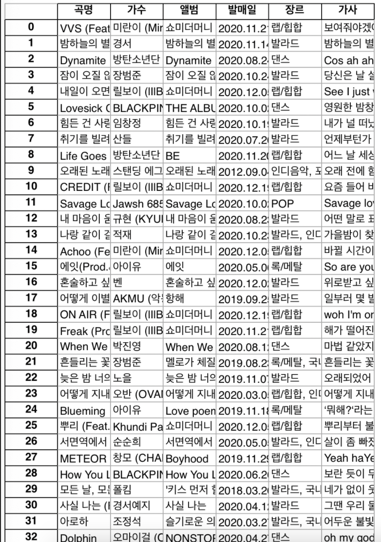 song_df.to_excel('data/melon100차트.xlsx', sheet_name='멜론100')