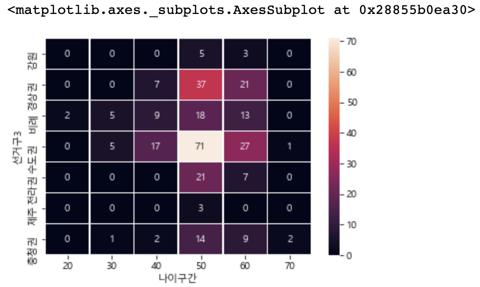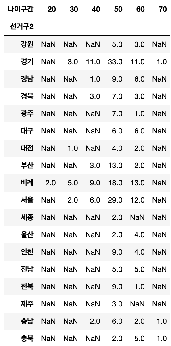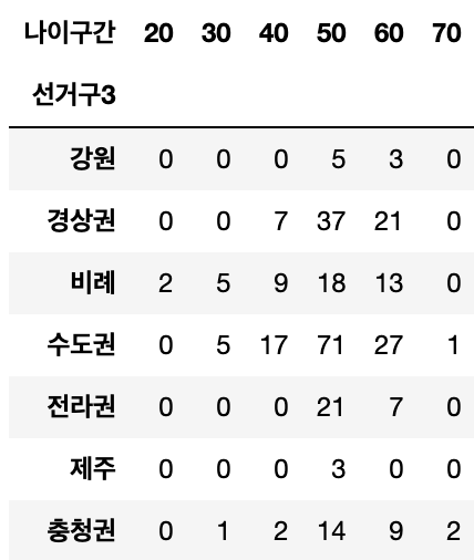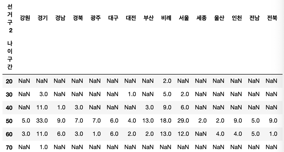age_pivot_df2 = member_df.pivot_table(index='선거구3',columns='나이구간',aggfunc='size').fillna(0).astype(int)