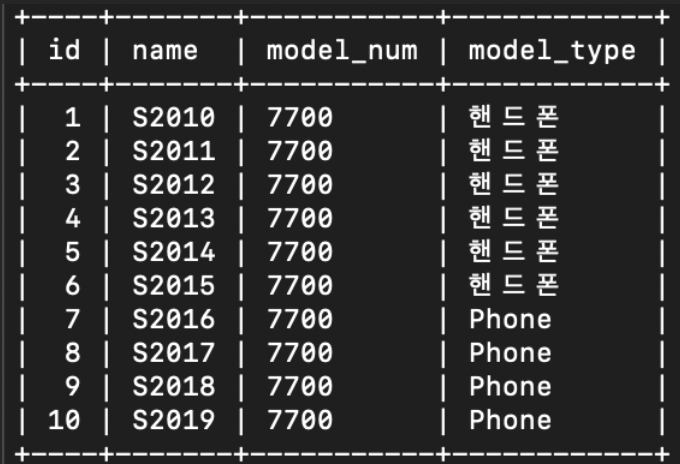 '\nCREATE TABLE product (\n id INT UNSIGNED NOT NULL AUTO_INCREMENT,\n name VARCHAR(20) NOT NULL,\n model_num VARCHAR(10) NOT NULL,\n model_type VARCHAR(10) NOT NULL,\n PRIMARY KEY(id)\n);\n'