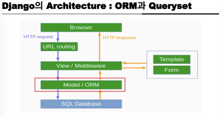 2) SQL을 직접 작성하지 않아도, Django Model을 통해 데이터베이스로의 접근 가능 (조회/추가/수정/삭제)