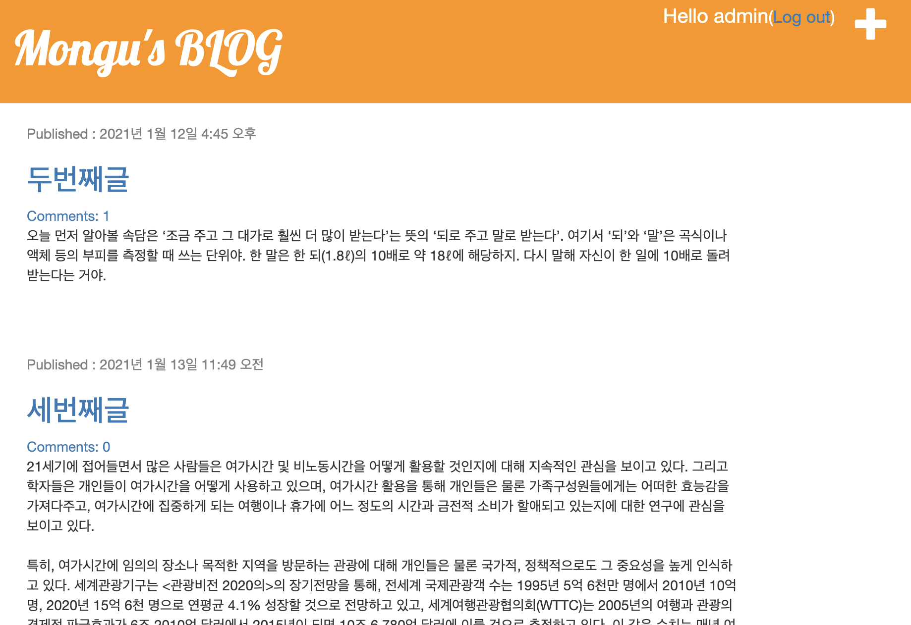 | 1/15 Django 4차시 - blog app 만들기(Maria DB, 페이징처리, django REST frame) (0) | 2021.01.15 |