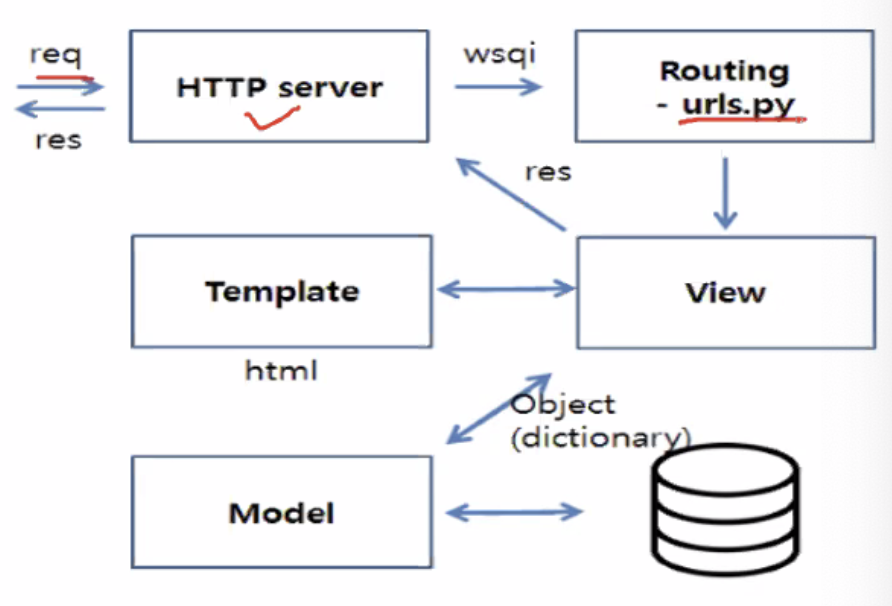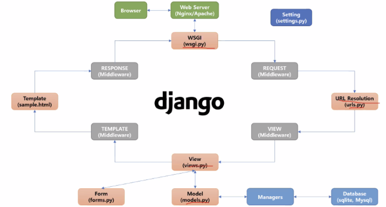 - 웹 서버에 요청이 오면 장고로 전달되고, 장고가 웹 페이지의 주소를 가져와 무엇을 할지 확인