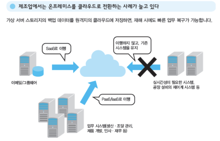 제조업에서는 온프레미스 시스템의 생산·조달 관리 시스템, 제품 개발 시스템, 인사·재무 등 기업 계열 시스템 등을 클라우드 서비스로 이행하는 사례가 늘어 가고 있습니다.
