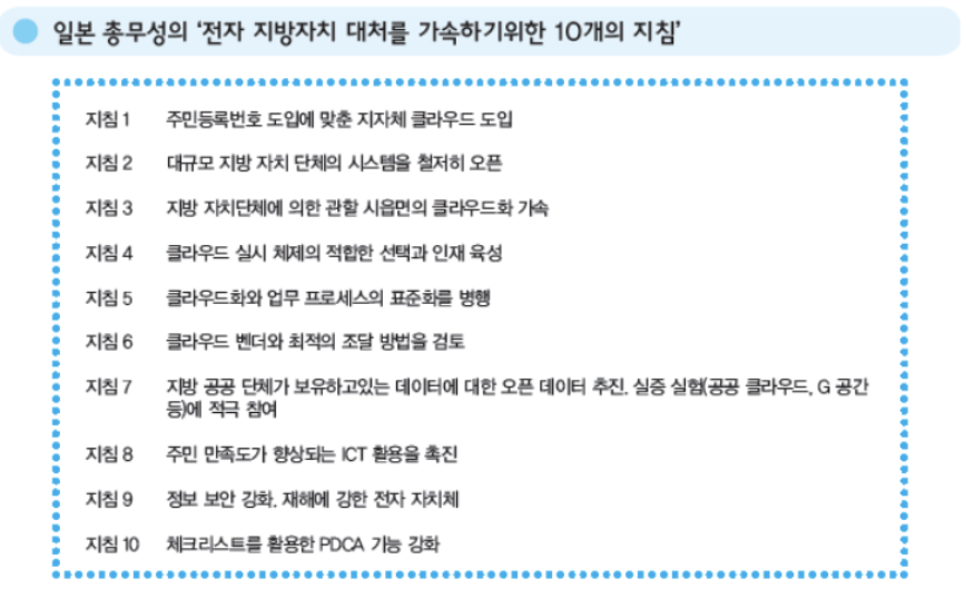 일본 총무성은 2014년 3월에 ‘전자 지방자치 대처를 가속하기 위한 10개의 지 침’을 공표하고, 지자체 클라우드 도입의 가속화를 최우선 과제로 구분하여 행 정 정보 시스템의 개혁에 대해 지방 자치 단체에 기대하고 있는 구체적인 방안 을 제시했습니다.