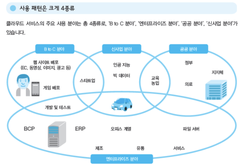 클라우드 서비스의 사용 패턴은 크게 나누어 4종류로 분류할 수 있습니다. EC 사이트와 동영상 전송의 웹 사이트 등의 기반으로 이용하는 ‘Bto C 분야’, 기업 내부 시스템의 기반으로 이용하는 ‘엔터프라이즈 분야’, 지차체와 교육 등의 공 공이용 기반으로 이용하는 ‘공공 분야’, IoT와 인공지능(AI), 빅 데이터 분석에 이용하는 ‘신사업 분야’가 그것입니다.