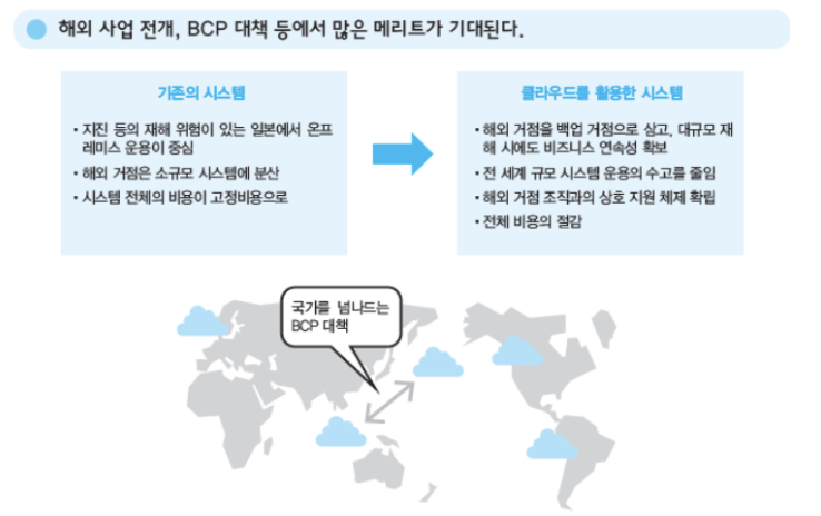 일본의 BCP 대책은 동일본의 도쿄 서일본의 오사카 등 지리적으로 떨어진 위치 에 데이터를 백업하는 것이 일반적입니다. 최근에는 일본에서 대규모 재해가 발 생하더라도 해외 거점에서 업무를 지속해서 수행할 수 있도록 해외에 백업 사이 트 환경을 마련해 두는 사례가 늘어나고 있습니다.